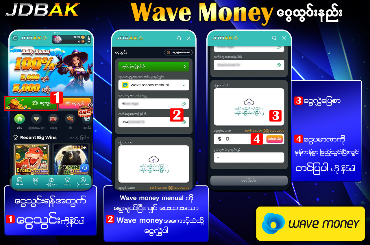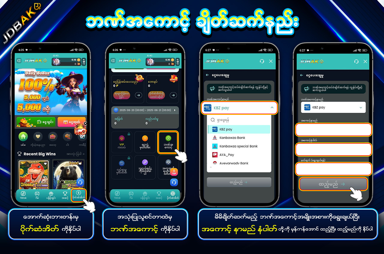 ငွေသွင်းခြင်းနှင့် ထုတ်ယူခြင်းကို လျင်မြန်စွာ ပြုလုပ်နိုင်ပြီး ယုံကြည်စိတ်ချရသော စနစ်ဖြင့် ဝန်ဆောင်မှုပေးထားပါသည်။