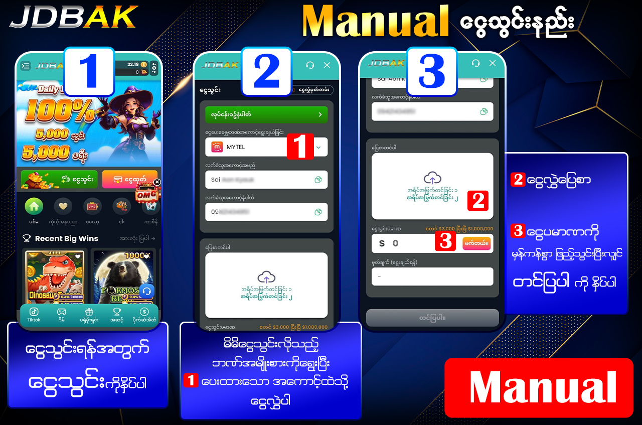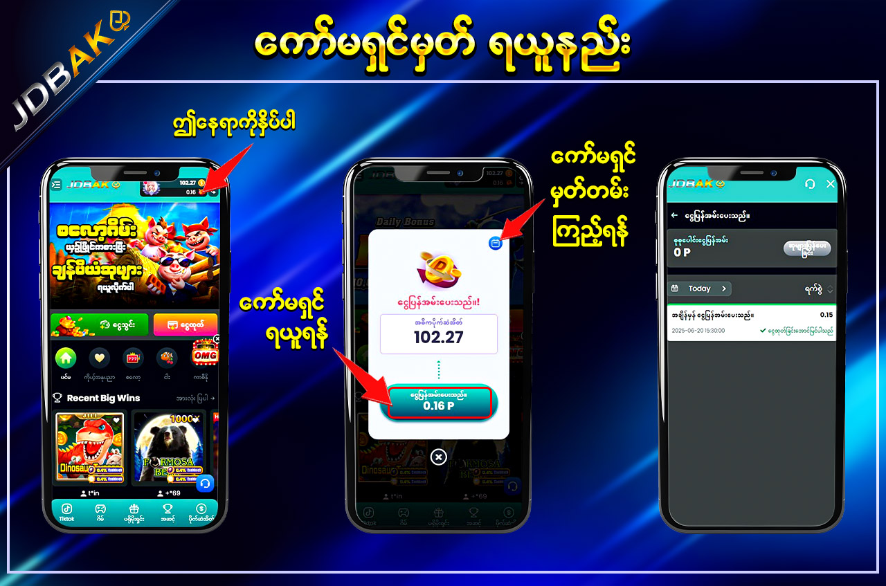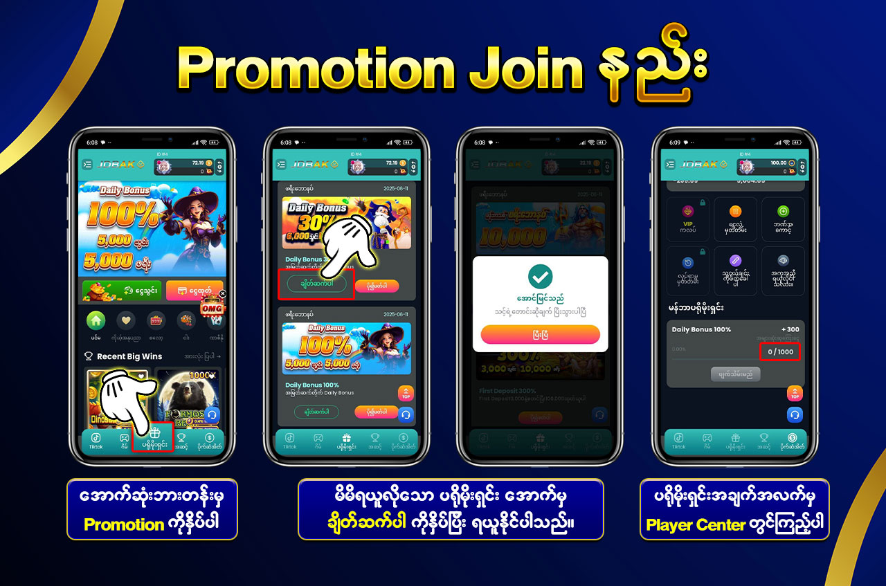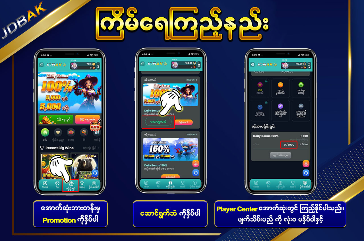 အကောင့်အသစ်ဖွင့်သူများအတွက် Free Bonus များ (3,000Ks / 5,000Ks / 70,000Ks) ရယူနိုင်ပြီး Deposit မလိုပဲ စတင်ကစားနိုင်သော Promotion များလည်း ပါဝင်ပါသည်။